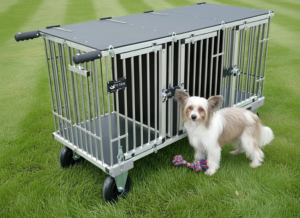 Bedankt dat u de tijd heeft genomen om onze gloednieuwe gigantische Titan hondenshowtrolley te bekijken. Deze versie is verkrijgbaar in varianten met 1 of 2 bedden. Bij het ontwerpen van deze trolley hadden we een paar rassen in gedachten die baat zouden hebben bij de extra ruimte. Rassen zoals Afghanen, Berner Sennenhonden, Newfoundlanders, Akita's, Old English, Briards, Samojeed, Saluki en Std Poodle.